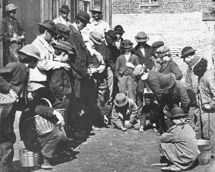 Major changes occurred in the 19th century. America was still mostly rural at the beginning of the century. This farm chores and hunting and fishing were major activities. Unfortunately even when photography appeared at mid-century, the predomintly indoor studio photographt does not capture activities, especially outdoor activities. We have a few photographs, like the boys palying marbles in Richmond at the end of thee Civil War (figure 1). Thus we have to turn to artists who did genre pintings. Fishing was often depicted because it was so popular among rural children throughout the century. And remenber that America was still promarily a rural country. A good example is George Lambdin's painting of rural children, 'The Bittle Children on the Schuylkill' (1869). The public school system steadily increased in importance, so school became increasingly important. Urbanization and industrialization brought important changes. Pets were brought into the home for the first time by average families. We see more manufactured toys, both wood and cast iron. Sports grew in importance and were very popular by the end of the century. Younger boys might play games. Religion was another important acvtivity and First Communion and Confirmation were important events. The Sunday School movement began during the century. We also see early summer camps at the end of the century. We see boys playing with hoops, knives, marbles, tops, and other items. Information is limited on the early 19th century, but the invention of photograpohy begins to provide more information (1840s). At first we just have clues suggested by studio props, but gradually we begin to in to see actual images of boys playing. This is especially the case at the end of the century. We are developing pages on each decade. So far we only have a page on the 1890s.