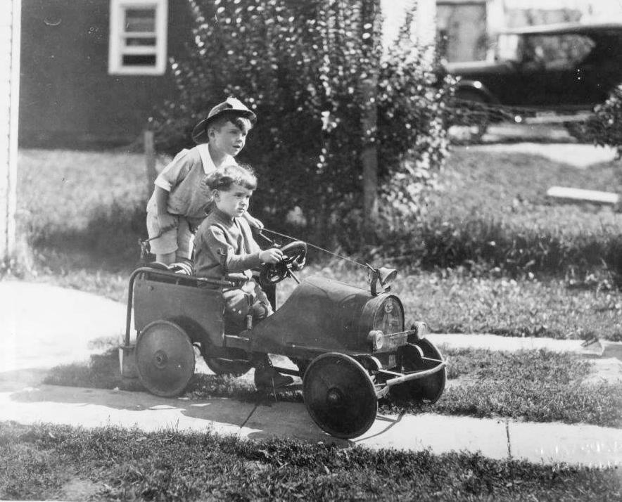 It did not take long for specialized vehicles to appear. Bright red fire trucks, of course withn a bell to mring, were popular. Many specialized vehickes appeared in the 1920s. An pedal car companies followed suit with new types like roadsters. We see pedal cars with large fenders, shiny radiators, and artistic hood ornaments(1920s). And with Lindburg's flight we begin to see airplane pedal cars. Cars got larger and heavier and we begin to see stramlining (1930s). Some of the largest pedal cars appeared at this time. We also see artillery wheels with large plated hubcaps. Evenbtually with the Space Race, we not only see rocket styling on cars, but also on pedal cars (1960s).