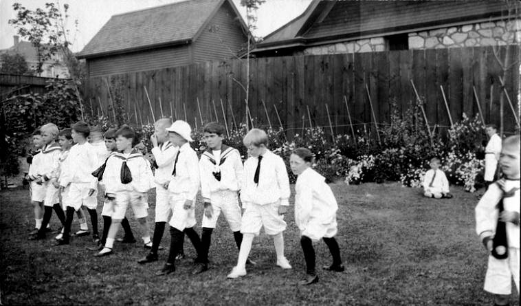 Dress and activity trends at American parties of course varied over time. Children in the 19th and early-20th century dessed up for parties. Parties, even children's parties, were much moral formal events than is the case today. Formal dress was quite common. We don't have much information from the 19th century, butvwith the invention of the Kodak Brownie and familt snap shot, we do from the early-20th century. Here we see rather formally dressed boys, probably in the 1910s (figure 1). After World War I and especially World War II, party dress became much more informal. This varied from family to family and was especially the case with afluent families. The overall trend was pronounced even with working-class families. And as dress became more comfortable and informal, the activities became increasingly important. For many years games like pin-the-tail on the donkey or musical chairs suficed. Gradually with rising incomesand child sophistication, more seems to have become required, we begin to see clowns and ponies and the invention of theme parties.