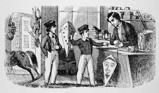 No photographs yet in the 1830s. Here we see a wood block engraving by Alexander Anderson illustrating a toy shop. It is undated, but we might guess was taken in the 1830s. It is interesting not only because of the toy on display, but because there were toy shops. And the suggestion is that this was nohing unusual nor not something just for the well-to-do. The boy is making a purchase with a coin. This may stream strange to our modern mind, but toy shops were just beginning to appear in the 18th century and were not very common until the 19th century. This was because not many working-class families could afford to purchase toys for children until the industrial revolution which was just beginning to take hold in America during the 1830s. (It had begun earlier in Britain.) And most parents before the 19th century saw play as not only a waste of time, but idel behqvior that was not good for the child. We can make out a range of toys, incuding balls, a drum a flag, a hand accordian, a hobby horse, kites, and pull toys (horse and waggon). They seem to be mostly wooden toy. Perhaps reader can make out other toys. Notice there is no sports gear. Strangely no dolls or other toys for the girls.