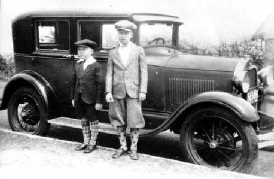 This photo was taken in Vineyard Haven, Mass. (Martha's Vineyard) in 1929. The car is a model A Ford (1928-29). The two boys, probably brothers, look as though they were dressed up for church. The older boy wears a knicker suit