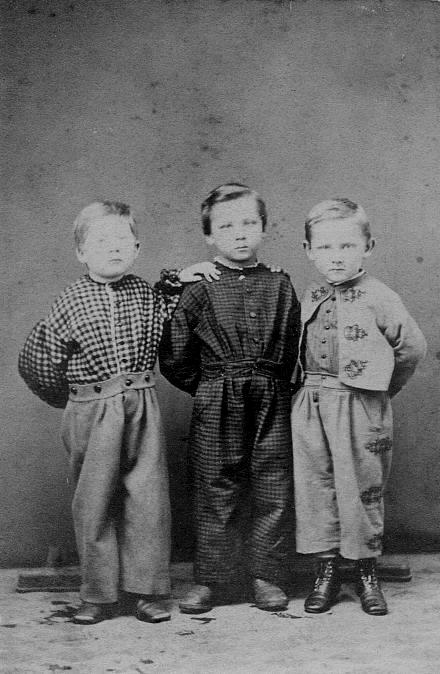 Boys' fashions at mid-19th Century were in a fluid state. The 1860s appears to have been something of a dividing line betwwern the old styles of the first half of the century amd the very different stles worn in the latter decades of the century. Fashion trends in the mid-19th Century did not move nearly as rapidly as trends move today. Clothes were still largely hand made and as a result still very expensive. The old styles such as tunics and skeleton suits disappeared in the 1860s. The new styles introduced, mostly originating in England, like kilts, sailor suits, knickers, and knee pants had appeared, but were still being accepted. Some major styles like Fauntleroy and Buster brown suits had not yet appeared. The major outfits worn by boys wwre blouses with pants, one-puece button-on outfits, and cut-away jacket suits. The blouse and pants was a commonly-worn outfit from the 1850s, the one-piece outfit and the cut-sawy jacket became very popular in the 60s. Somewhat-older bioys mught wear collar-buttobing hjackets, a yule populr in the 40s and-espcially the 50s. And older boys might wear suits with lapels. The major stylistic shift was the increased wearing of suits. The new styles had begun to appear by the mid-1860s, but for the most part were not widely accepted until the 1870s. This was in part a function of social class. The more home-spun families of agrarian America were less influenced by the new fashions while the wealthier more European families were. A good example is comparing the Lincolm and Davis families, the two rival presidents of North and South, during the 1860s. President Lincoln's boys mostly wore long pants as was prevalent in America. President Davis was a wealthy planter. His boys worn knicker outfits as was popular in France. The new European fashions would not becpme widely accepted in America until the 1870s.