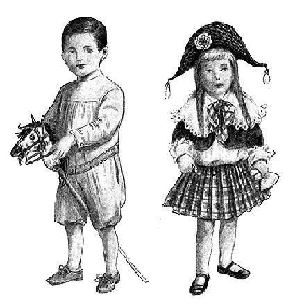 Isn’t this a fine little fellow with his blue linen jumpers and his hobby-horse? And then look at the unfortunate little soul next to him, dressed so that he cannot have a moment's freedom. Our little friend with the hobby-horse is ready to get right down to play, and have a "bully" time, while the poor little fellow with the curls cannot have any fun at all, with his ridiculous hat, and his big Fauntleroy collar and jacket.
