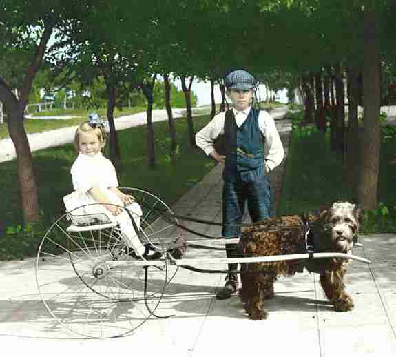 ![]() Figure 1.--The development of the Brownie camera in 1900 meant that for the first time, informal photographs appeared of children around the house. They still may be posed or dressed up, but the settings show us much more about the children and their clothing than ever before. This snapshot of the Olson children was taken in Milton North. Dakota during 1907. The colorization was amazingly good--note the wheel spikes. |