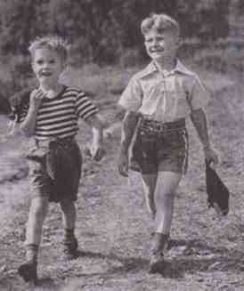 American boys commonly wore knickers in the 1930s. At the beginnng of the 1930s the knickers buckled at the knee. Most boys by the 1930s were wearing knickers that buckled below the knee. A new style of knickers appeared in the mid-1930s. Rather than buckling at the knee, the new style was elasticized. The boy then pulled his kneesocks up over the elasticised knicker hem. He then put a garter under the turn-over-top sock cuff to keep the sock up. Short pants varied somewhat depending on the boys' age. Younger boy wore very short shorts, often with short jackets. Older boys wore longer short pants, usually cut to knee length. Formal dressy short pants were mostly worn by younger boys. Mostly they were worn with ankle socks. Shorts were most common in the south and California. Some older boys in the northeast, especially boys from affluent families wore short pants with knees socks. Casual and play shorts were also worn mosly by younger boys--mostly during the summer. Somewhat older boys might wear play shorts, but even play shorts were not commonly worn by boys past elementary school. Many boys went to camp during the summer. Some of the more expensive camps had uniforms. Usually shirts with the camp logo and short pants. Some of these shrts had a vertical stripe on the side.