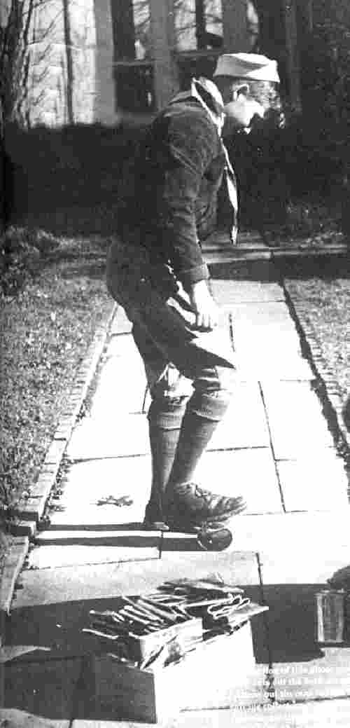![]() Figure 1.--This American boy is involved in a World War II tin can drive. He wears Scout knickers, notice how the kneesocks are worn over the knickers. He also wears a sailor cap. I don;t think he was a Sea Scouy, I think these caps werecjust popular during the War. |