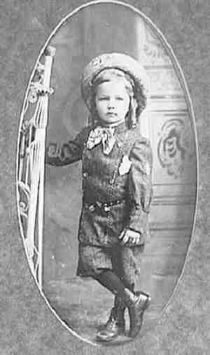 We have collected information about several individual American boys during the 1900s. Because of the time factor, no HBC reader has sent us a personal account of their boyhood experiences. We have noted accounbts in biographies as well as a great deal of photographic evidence. Younger boys were still outfitted in dresses and other skirted garments, but not as commonly as in the 1890s. We have noted many unidentifiedimages showing boys wearing dresses in the 1890s. One example here is Ernest Hemmingway whose mother liked to dress him and his sistr in matcing outfits. One of the most common outfits for yong boys after breaching was the tunic suit. Buster Brown and sailor styles were very popular. Harold Fitzroy-Carrington and the Ohio boy are good examples here. There arr many others. Boys still wore Fauntleroy suits, although sailor suts were much more common. Tom Wolfe wears a popular style of sailor suit. Older boys suits. Norfolk jackets were especially popular. Most boys wore their suits with knee pants or knickers, often with black or other dark-colored long stockings. The Pittsburg brothers are examples here. Most boys had short hair cuts, although shaved heads were rare. Some boys wore longer hair, even ringlets, although this was becoming less common. Even a few older boys, like Tom Wolfe, wore ringlets, but hated them. A few boys even had hair bows.