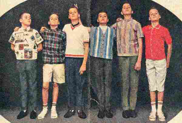 Madras was very popular for shirts. Boys in the 1964 wore slacks. Chinos were especially popular. Some boys wore Bermuda shorts, but most rejected the "clam diggers" clothing designers were trying to introduce.