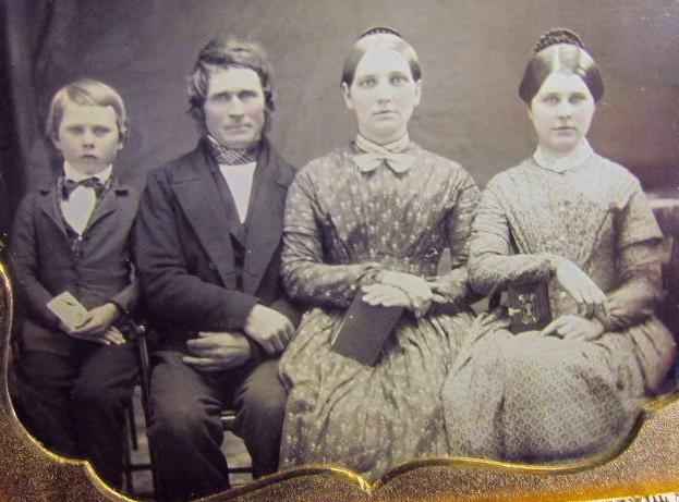 This 1/6th (2 3/4 x 3 1/4th inch) plate Daguerreotype shows an unidentified family with two children, a boy about 8 years old and a teen age daughter about 16 years old. As with most Dags, there is no information included in the cased about the subjects. The boy wears a single-breasted jackets with a difficultv to see patterned vest and long pants. Boys this age would tend to wear cut-away jackets by the late-50s and 60s. American boys almost always wore long pants in the first half of the 19th century, even youngr boys like the boy here. In Europe we begin to see boys from fashionable families beginning to wear shortened-length pants, at least by the late-40s and early-50s. This trend was later to appear in America. We can't tell about the collar, but he has a small bow rather than a stock. Notice that his father has a patterned stock and not a back one. Notice his faher's wide lapels worn with a vest that also had lapels. Mother and daughter are primly drssed in similar patterned dreses. Notie their tighly done hair tyles. Mother has carefully combed the boy's hair, but the husband's hair is wild. He does not seem to own a comb. Rarely do we see such a difference in hair grooming in the early photographs. We think this is an 1840s Dag, perhaps the late-40s or early-50s. We are, however, not at all positive. We do not yet hve a good fix on descriminating between 1840s and 50s Dags. Perhaps readers will have some clue. The clothes suggest to us that the family was in comfortable circumstances. Unlike the CDVs which appeared in the 1860s, Dags were rather expensive, just a fraction of a painted portrait, but expensive in 1840s-50s term. And this was before the huge industrial boom that brought unprecedented prosperity to America. Thus we mostly see people in comfortable circumstabces having Daguerreotype portraits taken. We do not mean to suggest just rich people, but mostly-middle class people or skilled workers earning a good income.