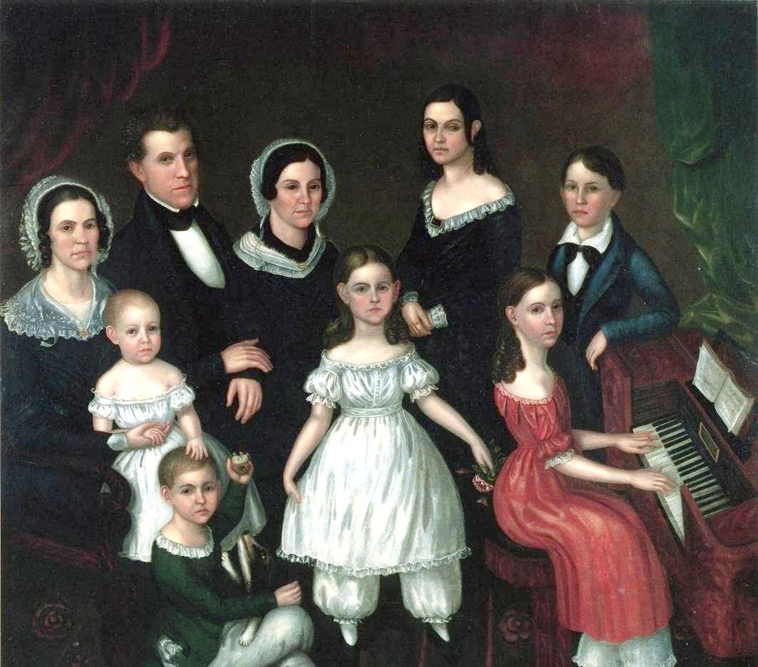 We have found a naive portrait of the Dr. Lewis G Thompson family painted by Horace Rockwell (1811-77) about 1842-44. He has rather crammed everone togther, but the facial depictions and the clothing details are very good. We know very little about the artist. Horace Rockwell was an early itinerant artist to work in Indiana. He also did a portrait of the Judge Samuel Hanna family in 1843. Rockwell may be from New York and seems to have practiced in Philadelphia before coming West. His career choice as an artist was notvwek=ll tines as he had to compete with photography. He dabble in inventions and was killed when a flying machine he built did not fly. We know a little about Dr. Lewis Garret Thompson (1803-45) who died shortly after the portrait was painted. Dr. Thompson apparently was from Ohio, at least he graduated from the Ohio Medical College in 1837 according to A Medical History of the State of Indiana by G. W. H. Kemper. His paractice was in Fort Wayne Indiana. He apparently got his degree after he moved to Fort Wayne where he arrived (1825). This was very early in Indiana's development which only became a state in 1816. He served served on the Fort Wayne Board of Health and in the Indiana House of Representatives. He practiced medicine and surgery with a Dr. Sturgis on Columbia St. in Fort Wayne. He looks to be a prosperous individual with his large, well dressed family. He seens to have had trouble collecting his fees, and adverised that he accepted payment in produce. When he died he had many uncollected fees. Also in the portrait are Ann McFarland Scott Thompson (1805-90), Eliza Scott Forsythe, c. 1805 - ?), Margaret Forsythe (1842 - ?), and unidentified children. The portrait remained in the Thompson family until donated by descendents of Ann Eliza, the girl at the piano. Many of the children except the older boy have low necklines including the yonger boy who has ruffled trim around his neckline top. The adults wear black, but the childre are allowed white or color. The girl's bright red dress seems a rather bold statement. The portrait includes the family pooch who the yoinger boy is holding and want somethingbthe boynis hilding in his hand. wants