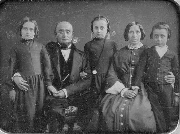 Here we have a wonderful half-plate Daguerreotype of a Cinncinati, Ohio family. The portrait was taken at the Faris studio. The portrait is undated, but the fact that it is a Daguerreotype and based on the clothing and hair style, it is most likely a pre-Civil War portrait. Thus the 1850s is a good approximation. This is a charming family portrait showing a very tender relationship within the family. Some portraits are taken with family members not touching each other. Here despite the fact that the family members had to be very still for the portrait, it does not have the stiff feeling of many old portraits. It also provides a wonderful look of period hair styles and clothing. We can't say much about the father's hair, but note the sideburns and the beard. Mom and the girls have center parts. The curls have braids and curls. The boy has longish hair, but it is not curled. The children all seem primly dressed. We have no idea wht the colors may have been, The curls have different dresses, a bit more utilarian than mom's wide sleeves. The boy wears a suit jacket. Note tht his jacket does not have lapels and he wears a collarless shirt. I would guess mom made the children's clothes.