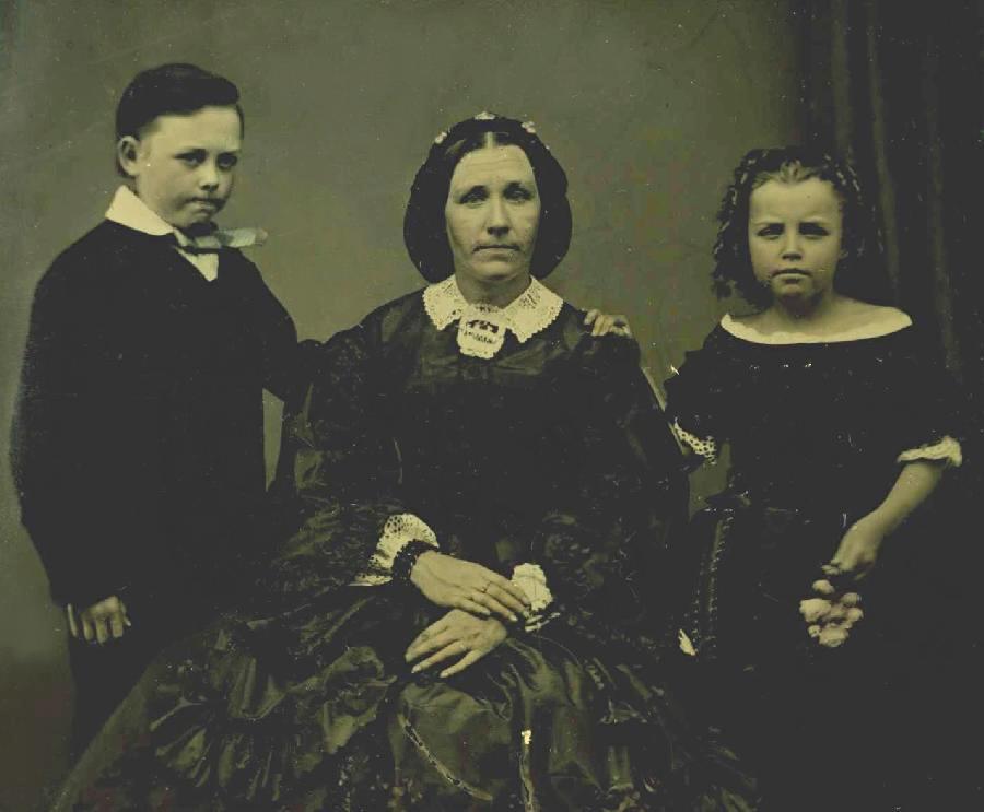 We do not know where in Anmerica it was taken. The mother wears a voluminous dress with a small lace collar. Women's dresses at the time used copious quantities of fabric. The children look 8-10 years old. The girl wears a low-cut dress edged with trim and holds flowers. Her hair ids done in ringlert curls. Her older brother wears a dark jacket that does not button at ther collar, but we cannot make out much detail. He has a prominant starched collar which he wears with a blue stock, tinted in the ambro. Bows were not yet very common.