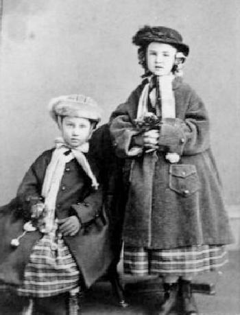 One portrait is identified Anna and Emily Schlesinger. And it is dates--1863. We thus assume the photographs are all of the Schesingers, but the other portraits are not specifically identified. The girls are dressed identically, except for theor hats. The portrait is very interesting because it shows not only the girls' beplumed hats, but their overcoatrs as well. Notice the heavy overcoats. They help to confirm a norther location like New York. Plumes in the late 19th and early 20th century were widely used for hats and some bord species were adversely affected. The dresses unlike their hats were still very simple. They both wear wjite long stockings, very common for both boys and girls at the time. They look to be some sort of plaid pattern. They look to be about 5-7 years old. We see another portrait of Anna, probably taken on the same day. this time with her coat off so we can see how simple her dress was. She is with an unidentified biy, probably her older brother.