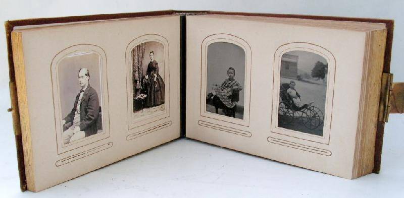 This leather family photographic album is a good example of the albums that appeared in American parlors during the 1860s. We do not notice them in the 1850s although there may habe been some. We notice many in the 1860s. We assume that the idea was imported from Europe, but do not know this for a fact. This one is a front side latch closing book. It had about 25 pages showing two images on each faceing page. The stiff pages were structured so that the portraits could easily be slipped in prepared slots. The album measures 9" x 8" x 3". Some albums were larger and showed four photographs on a page.