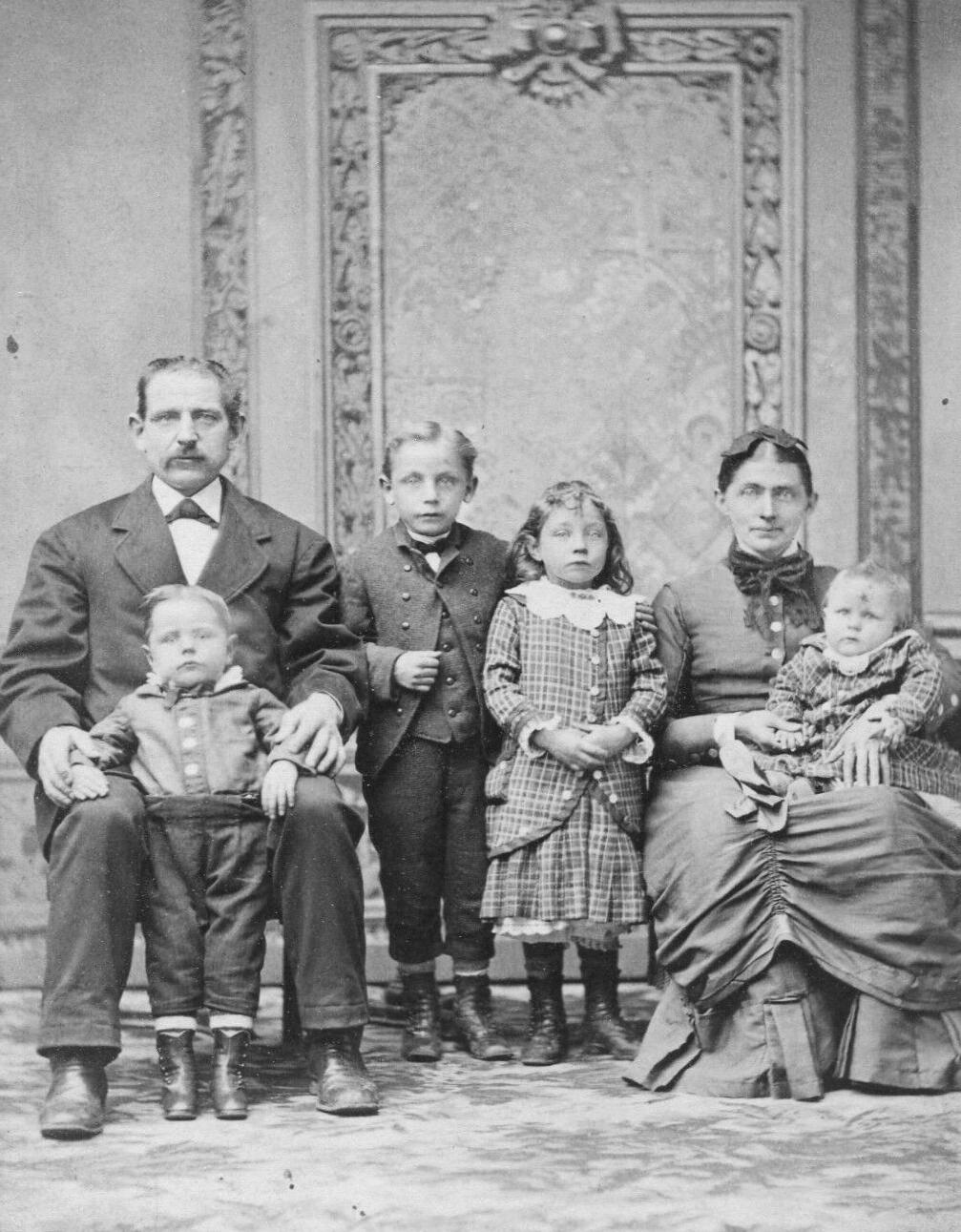 This cabinet card shows a young family with four young children. They are not identified, but look to be about 1-8 years old. Mother and farher are well, but plainly dressed. Thbere is a baby aliong with two boys and a girl. The girl wears a kind of jacketed dress with a large collar. The younger boy waes a buttoin blouse and pants affair. His older brother wears a vested cut-away jacket suit. Both boys appear to be wearing shortened-length pants, but very long knee pants reaching almost to the ankles. We use the tern knee oants as a ggeneric term as they would eventually done at knee lkength, but when they first appeared, as we see here were longer and done basically at calf-length. This at a time that knee-pants were just beginning to catch on for school-age boys. We can not date the portrait with any precission. We would guess that it was taken in the late-1860s, but the early-70s is certainly possible. The studio was Kellmer's Photograph Parlors in Hazleton, Pennsylvania.