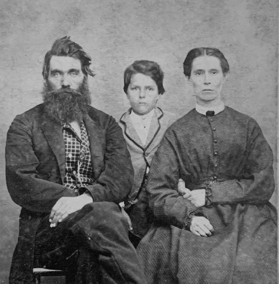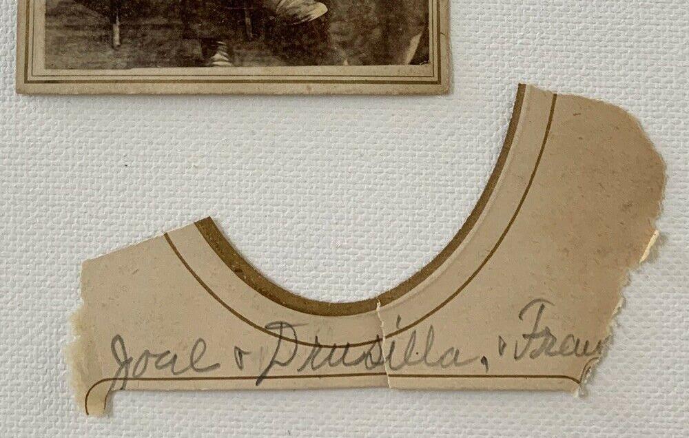 Here we see a CDV portrait of what we thought might be farm family, although most farm families were larger. Father has an impressive beard. Beards like this were popular after the Civil War. Mother and father are plainly dressed, but their son behind them looks to be about 8 years old. we cabn only see the top of his outfit. He wears a fashionable suit done with piping. Neither father or son have neckwear which was unusual. The boys seems to be wearing a shirtwaist as we do not see a collar. Notice the boy holding hands with mother. We think the portait may have been taken just after the Civil War in the mid-1860s. The parents names were Joal and Prusilla. The boy's name is cut off but looks to be something like Freu???. There was no studio information, but the CDV was kept in a CDV album.