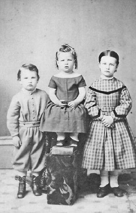 The three children in an unidentified family were photographed at Clayton's studio at the corner of Santa Clara and Market Streets in San Jose, presumably California. California was very lightly populated until the Mexican War (1846-48). Large numbers of people were drawn to California by the discovery of gold (1848). It quickly was admitted to the Union (1850). This portrairt dies not have a Federal revenue stamp so presumasbly it was taken after the Civil War in the late 1860s. The older child is a girl wearing a plaid dress. The middle age child is a boy wearing a juvenile suit with bloomer knickers. We are unsure about the younger child wearing an elasborate hair style and plain-colored dressith a low-neckline. This was quite cimmon for young children. We would guess the child is a boy, but we are not sure.