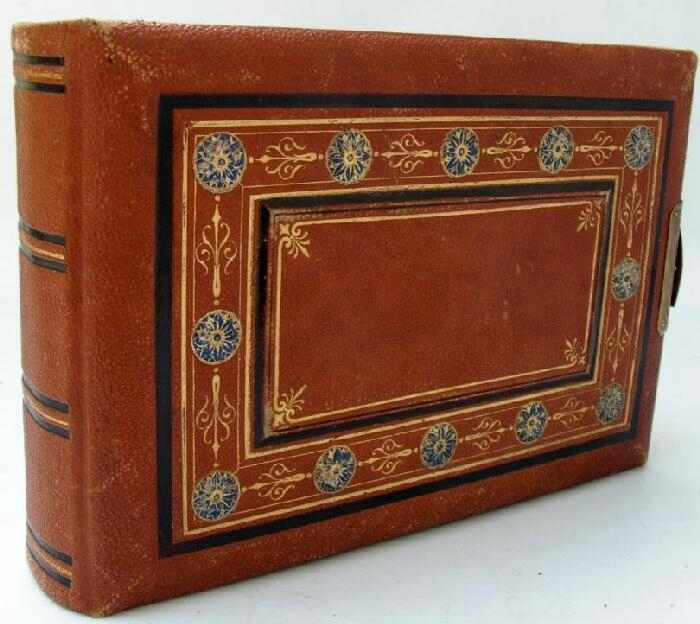 This leather family photographic album is a good example of the albums that appeared in American parlors during the 1860s. We do not notice them in the 1850s although there may habe been some. We notice many in the 1860s. Ibassumevthe idea was imported from Europe, but doi not know this for a fact. This one is a front side latch closing book. It had about 25 pages showing two images on each facing page. The stiff pages were structured so that the portraits could easily be slipped in prepared slots. The album measures 9" x 8" x 3". Some albums were larger and showed four photographs on a page.