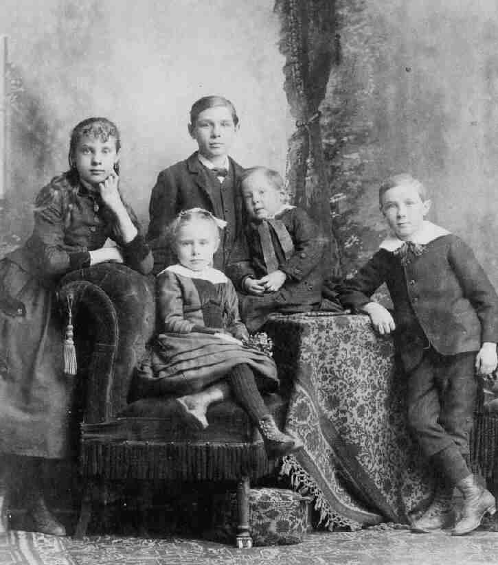 Here we have the children of what looks to be an affluent family. There are five children, three boys and two girls. All we know for sure is that the family was from Ohio. We might haVE guessed that the portrait was taken in the late 1870s, but it appears to have been taken in the mid- or late 1880s. We think there are several helpful chronological indicators here. Note the older boys wears a stock rathar than a tie and stocks were not very stylish by the 1880s, although the boys wide collar does seem like a 1880s style. I'm not sure how to date the girls' dresses. Perhaps a HBC reder will have some insight here. Also note the younger boy's long knee pants and small bow. Both of these seem more appropriate to the 1870s than the late 80s. The HBC reader who has the portrait tells us, "The portrait is not dated, but it appears to be from the late 1880s. There is a patent note on theback which tells us that the portrait is not earlier than 1886. And what I have seen from the 1880s fashion supports this theory."