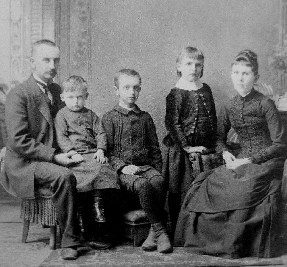 This cabinet card shows an unidentified Grand Rapids family. Unfortunately the portait is not dated so we are left to estimate it. Unfortunatley this is very difficult. We like to add dates images here, but do include undated images in the hope that we can estimate the date accurately or can prefect our estimate over time. We do not see any clear indicators. The dealer suggested the 1890s. We believe that that the early-1880s is more likely, although we are not at all sure. We think the boy's black long stockings suggests the 1880s, but the absence of Fauntleroy trim would lead one to look at the early-80s. And mother's dress without the baloon sleeves we think means that the 1890s is unlikely --except perhaps for the very early-90s. The children look to be about 3-10 years old. The younger boy wears sa kilt suit. The older boy wears a collar-buttoning knee pants suit with Norfolk vertical pleats. We think the other chils is a girl who wears a jacketed dress with a ruffled collar. Assessing gender is a tricky thing. This child looks rather like a boy, but the fact thar the younger boy has had his curls cut, means that this child certainly is a girl.