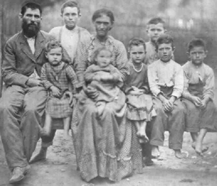 Here we have an image of an unidentified Arkansas farm family. Arkansas was a poor, largely rural state. The economy had been damaged by the Civil War and even by the 1880s the lingering impact of the War was still affecting Arkansas and the other Southern states. We believe the portrait here was probably taken in the early-1880s, but are not quite sure precisely when. The family was in Logan County. The father's beard is one factor suggesting the 1880s. The portrait was presumably taken by an itenerate photographer. The family is posed on a bench of some kind in the outdoors. The children's clothes are interesting. Notice that overalls are not yet being worn. Also the children are barefoot which suggests, as does the rest of the clothing, that the family was not very prosperous. Also note the boys wearing longpants. Many American boys by the 1880s were wearing kneepants. This was less common anmong urban working poor as well as poor farm families. We suspect that the family may be share cropers.
