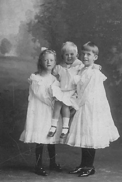 Unfortunalely we have no information about this unidentified American family. It is also undated, but we would guess was taken in the 1890s. The early 1900s is possible, but the 1890s seems more likely to us. The portrait has a white border which might help date it. The children lool to be about 2-8 years old. We do not know who the children are, but surely they are a sister and two brothers. It is possible of course that the child on the right is a girl with short hair. We think that this is unlikely, however, because a mother would be unlikely to do one girl with long hair and a hair bow and the other with short hair. This is especially true because the older child is the one with short hair. Notice how the younger child has his hair done like his older brother. The children all look to be wearing very frilly white smocks. Usually smocks were a more utilitarian garment. Perhaps the garments are better described as summer frocks. The older boy looks a bit old to still be wearing frocks. Many mothers at the time liked to address the children in identical outfits. They are dressed alike except that the older chilren wear black long stockings and the younger boy short white socks.