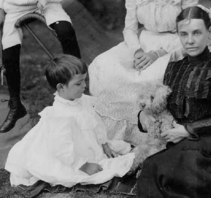 The girls in white are presumably the five Spencer daughters (Adeline, Kate, Ethel, Mary and Elizabeth). They are all done out in immaculate white dresses. Notice that the youngest daughter (Elizabeth I think) has very short hair. She might be mistaken for a boy. Only two the girls wear hair bows. Elizabeth is occupying herself with the family dog and seems a lot happier about the family photograph than her brother Charles.