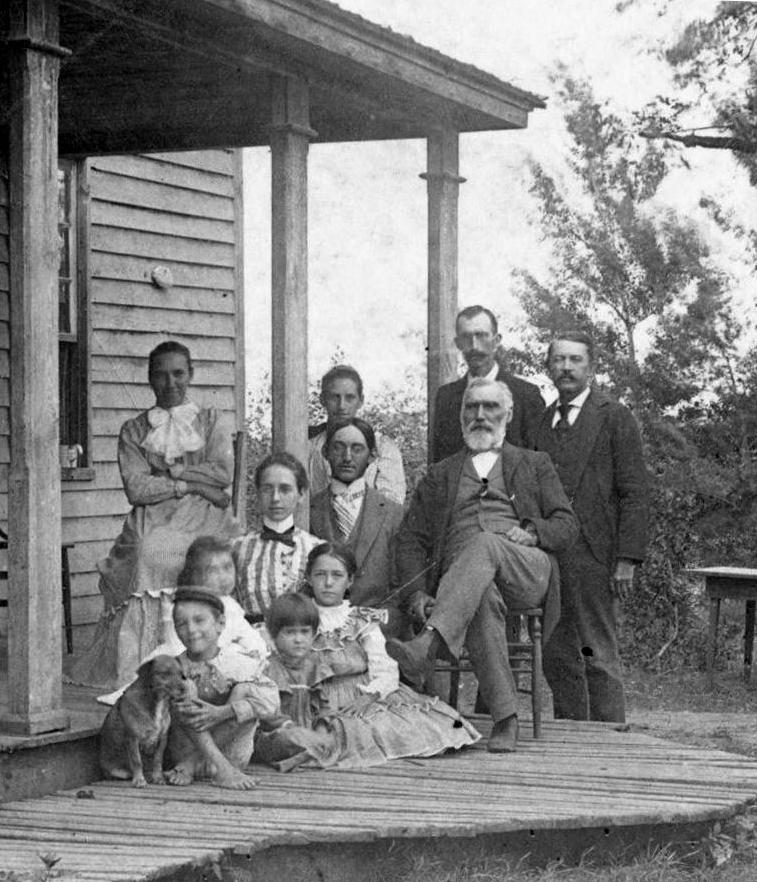 This is another unidentified family in reasonable circumstances. We see them on the porch of their rural home (figure 1). There is no information associated with the cabinet card portrait. We suspect that it may be somewhere in the South. After the turn-of-the 20th century we see more images like this taken outside studios. So we not only have fashion information, but get to see views at home which tells us about their circumstances. Here we see grand parents, adult children, and the grandkids, The girls wear dresses. The boy with his pooch wears a Fauntleroy blouse and is barefoot The portrait is undated. The Faunleroy blouse abd the mount style, however, suggest the 1900s.