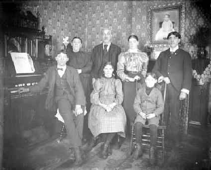 Here we have another Pittsburgh family about 1900. It is unfortunately a small image, but interesting because it shows the inside of the family hime. We don't know the family's name. They seem to be a family in comfortable circumstances, but not a rich family. They are in a Victorian-style parlor of which the prominent musical instrument is an organ. Mother and father and adult relatives occupy the back row. Three children, apparently siblings, are seated in the front row. The oldest boy, about 18, sits on the organ stool propped up by what looks like a pillow or a folded blanket. He wears a three-piece suit and a white shirt with bow tie. Notice the center-parted hair. The girl, about 14, wears a dress of checked material with puffled sleeves, a high neck, black stockings, and hightop shoes. The youngest child, a boy of about 11, wears a knee pants suit, long black stockings, and hightop shoes. He seems to wear a turtleneck sweater or high-necked dark shirt without a tie under his jacket. The stockings have to be fairly long because of the length of the knee pants.
