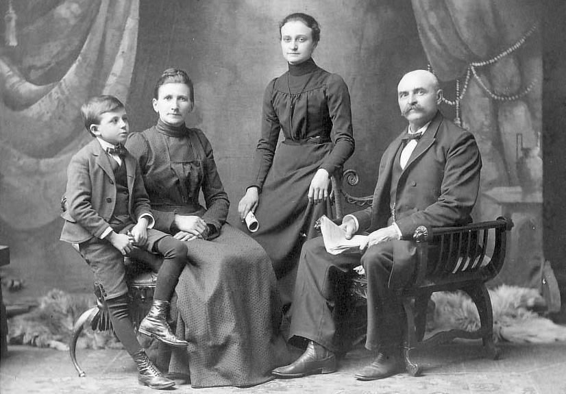 This cabinet card portrait has no information to help with our assessments, even studio information. All we have besides the clothing to go on is the card mount. And this suggests the 1900s. Along with the clothes we would suggest the mid-1900s, about 1905. We do not know much about women's dresses, but the two women wear dresses that do not look like the 1890s to us. And the boy's knee pants were no longer common in the the 1910s. The boy's lace-up high-top shoes also suggest the late-1900s. Button shoes were more common in the early-1900s. The portrait shows the mother and father. We think the other woman is an older daugter. The boy looks to be about 10 years old. He wears a vested suit with knee pants and long stockings. We are not sure just what he neckwear is, but it is small compared to the large floppy bows commonly worn in the 1890s. Notice the bell he is holding.
