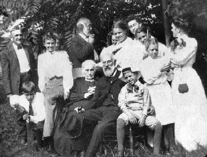 The precise identity of this family is unknown. We do know that the photograph was taken on Martha's Vinyard, a island south of Cape Cod in Massachusetts. The family looks prosperous. Martha's Vinyasrd is today a very prosperous community. We believe the same was true at the turn of the century, but probably not nearly as true as today. The photograph wasc taken about 1905-06. The squinting boy in the front row (about 10 or 11 probably) wears above-the-knee knickers with longs tockings and a shirt with a floppy bow. Notice also his little low-crowned brimless black hat. It looks as though he is a bit unhappy at having his picture taken with the rest of his clan. Perhaps he doesn't like having to be so dressed up for the occasion, or maybe the sun is in his eyes. He appears to be wearing bloomer knickers like those worn with a tunic suit, more than the knickers worn by themselves. Somewhat unusually, his stockings appear not to be black (the standard color at this time) but of some lighter color (possibly brown). For details on see long stockings color. One reader suggests that the long stockings may be black but simply faded from wear. [HBC believes that this unlikely. We note periods from this era showeing boys wearing well-worn long stockings that are still recognizably black.] The other boy on the holds what looks like a small guitar. He wears a more grown-up white shirt and tie, I think with long pants, although his position makes it difficult to be sure.