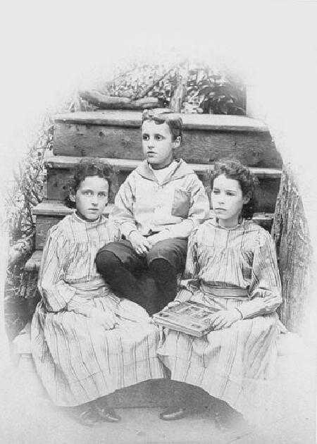 Unfortunatelt this snap shot is unidentified. The fact that it is a snapshot and the style of the clothes suggest to us that it was probably taken about 1905-10. This is just a guess. We would be interested in any assessments readers may have. The boy wears a ehite middy blouse with a colored trim and a colored patch pocket. He also wears kneepants and long stockings. He looks to be about 8-9 years old. His sisters look a little older and wear matching dresses.