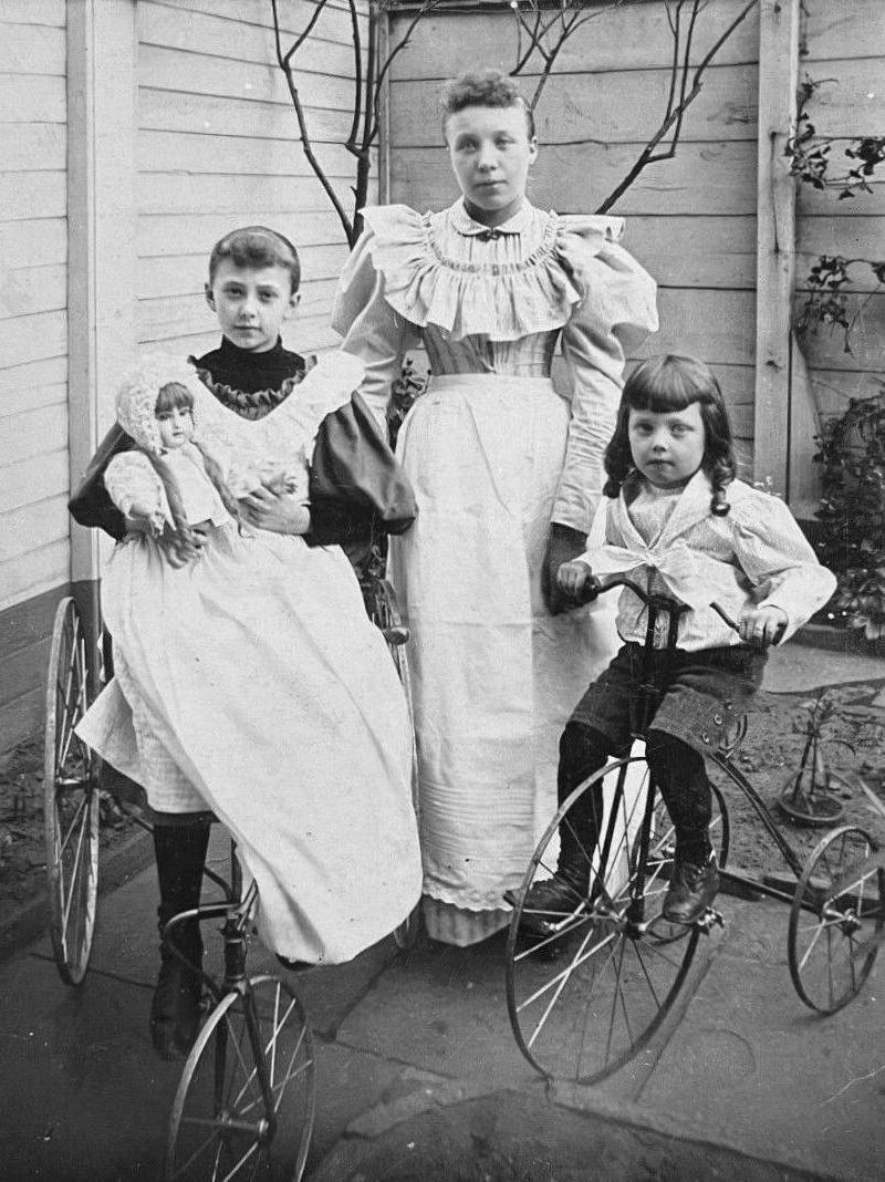 Here we have a comfortable middle-class New York family. We know that becuse both children have tricycles and the family has a maid. Having help in the 1900s decade was not a sign of wealth, but it does indicate the family lived in comfortable circumstances. We see both children on trikes even though the girls is older than the boy. She is on what might be seen as a girl's mmodel. The portrait was taken outside their New York City home with their maid Gussie whiose duties appraently included looking after the children. Unfortunately the potrait is undated. Mounts are useful in dating these old photographs. The cabinet card mount was one of the new styles,wgich would mean that the portrait was taken in the early-1900s decade. Yet the dress styles look more likeabout 1895. The Cabinet card was 8.5 x 6.5 in; image size: 6.25 x 4.75 inches. The photographr's studio imprint stamped on verso, indicating "Yard of Perry St. House." We are not sure what that meant. These stramped imprints were not common in the 1890s. Given how nicely posed the image is, we suspect the studio sent out a phothtraphers to the home. Incliding a maid in the potrait is also interesting. Most families did not do this. The boy looks to be about 5 years old and wears a rather plain sailor blouse with Fauntleroy ringlet curls. The Faunteroy style including ringlets was declining in popularity, but we continue tp see exmaples in the early-1900s. The girl looks to be wearing a pinafore and proudly holds her doll. The studio was the Instantaneous Photo. View Co.