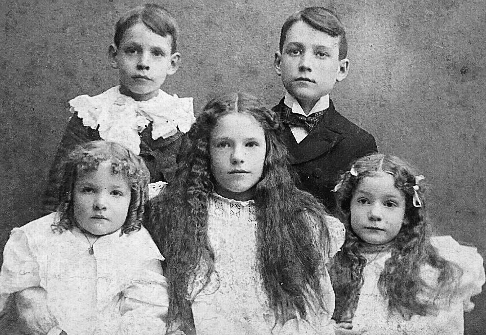 This cabinet card studio portrait show five beautifully dressed children will carefully done hair. The children are three girls and two boys, ienbtified as Lewis, Isabel, George, Marguerite, and Betavia. Presumably they are all siblings, but their last name is not indicated. The children look to be about 3-15 years old. The two boys look to be about 8-12 years old. The photograph was for 'Hattie and Mattie'. The two boys wear suits. The younger boy has a ruffled Fauntleroy collar. The older boy has a wing collar. The three girls have varied hair styles and white dresses. The portrait is not dated. We believe it was probably taken about 1900-05 because it was a new style mount. The very late 1980s is possible, but less likely. The mount measures 5-3/4" x 6-7/8, slightly larger than the classic cabinet card. The studio was Morse & Kirk of Hudson, Ohio.
