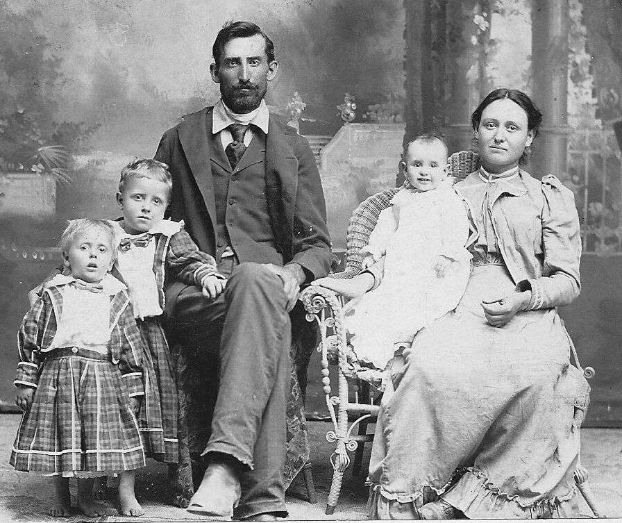 This family portrait shows the Carroll family. It was taken in 1901 at Price Photo Studio, in Jacksboro, a small town west of Dallas. We know nothing about the family. They seem reasonably well off, but not well-tp-do. Jackboro was a small town serving aan agricultural and ranching area. We are unsure if the family lived in town or came into town from a farm or ranch to have their portrait taken. We suspect they came into town. Notice the father's poorly fitted collar and the ragged hem of his pants. Mother is much more careful about her appearance. Left to right we can see Merritt Douglas (born in 1898), Othello Elisha Columbus (born in 1895), the father Steven Bennett, the baby Effie Estella (born in 1900) and the mother Jane Marley. The boys are wearing checkered kilt suits with Fautleroy touches, a style beginning to go out of fashion at the time. Both boys are barefoot, this was very common even in formal portraits at the time, especilly in the South. Interestingly a portrait taken earlier would have had the boys wearing long stockings and shoes. For some reason around the turn-of-the century and throughout the 1900s we see portraits with barefoot children.