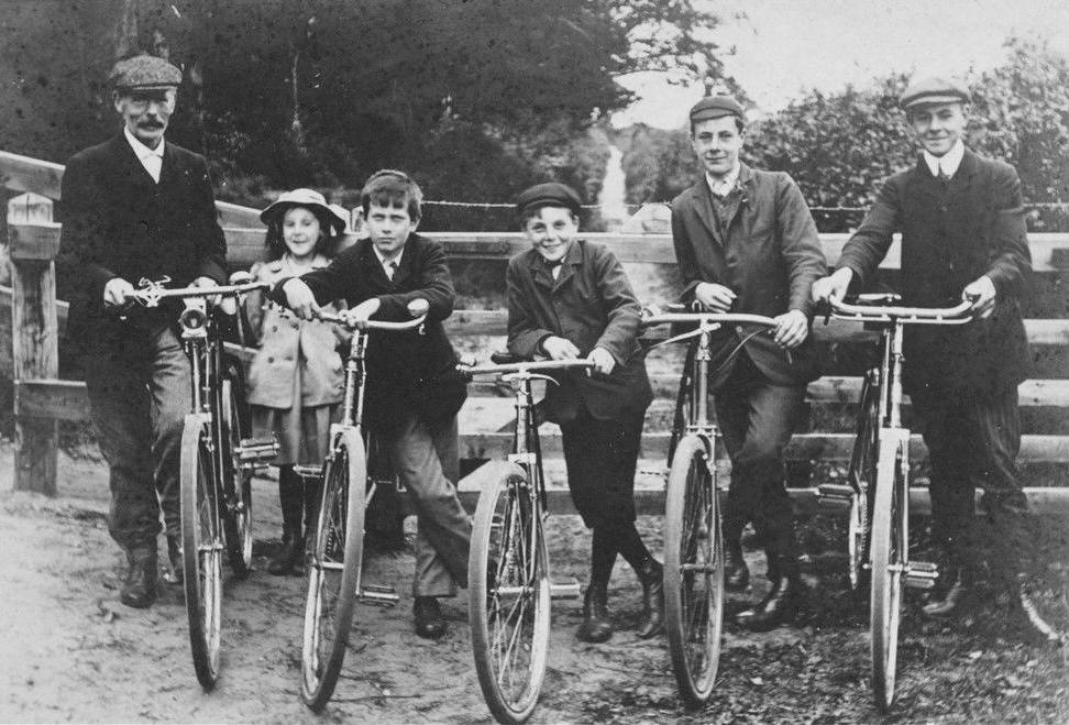Here we see cabinet card of the William Smith family on a famnily bike outing. Bikes were not cheap at the time, sothe family clear was one in cimfotrable circumstances. We know the names of everyone. There is a happy group of kids, and the father standing proudly with their bicycles. The writing on the back reads, "William Smith, Rosie Smith, Fred, Charlie, Wallie". They look to be about 7-20 years of age. Everyone but Rosie gets a bike for the outing. Rosie wears a non-descript hat. The man and his four sons mostly wear flat caps. One of the boys wears a peaked cap. Flat caps becme standard in the 1910s, but there was still some diversuty in the 1900s. In Britain it would suggest a school cap, but in America they did not have a strong school association. They are all wearing suit. All the boys except one wears long pants suits. One boy has a knee pants suit. At the time it was rather unusual for a younger boy to wear long pants. That and the mount style suggests it was taken about 1905. There is no studio information on the mount.