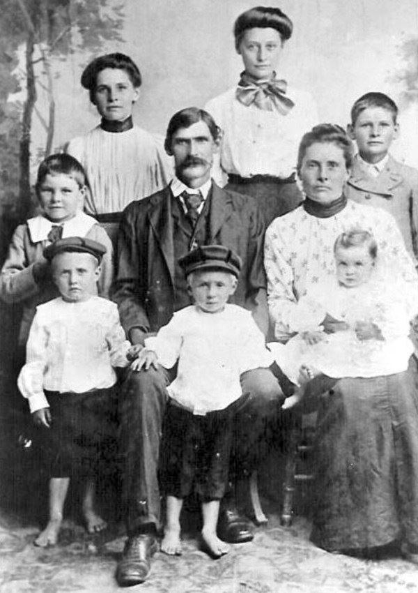 This family portrait shows Esquire Thomas Ford and Mary Jane Smart with their seven children who look to be about 1-20 years of age. In the back row we can see Verna, Stella and Henry. At the side of Esquire Thomas there is Walter and in front row the twins Earl and Ervin. Bessie is sitting on the knees of Mary Janes. The photo was taken in Tennessee in 1906. Another child, Bertha, will be born in 1907. The younger twin boys wear Fauntleroy blouses with knee pants and curiously flat cap. Walter wears suit with what looks like a large white square collar. Henry wears a suit with high-set lapels. The older girls wear blouses and skirts, on with a floppu bow. This is a good example of family portraits with barefoot children in the 1900s. We are not sure why this suddenly became so common. It is not as if going barefoot suddenly became common. Boys commonly went brefoot throughout the 19th century, but mostly put on shoes abd sicks for a portrait. and then in the 1900s, especilly the late 10s we suddenly see the children pitting on their shoes and socks for portraits again. We have no idea why so many barefoot children uddenly apprared in the 1900s. We would understand it if we were talking about family snapshots, but we are talking bout sudio portraits. And notice that everyone dressed up for the portrait. Many of these images come from southern states and they are often tin-types and taken in low budget, perhaps carnival studios. But why they are suddenly so common we do not know. A readr points out, "This is really something calling attention in formal portrait, when people clearly dressed up for the occasion."