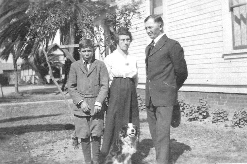 This is the George Vance family with the family pooch. They look to be a prosperous middle-class family. We see Mr. Vance with his wife and son. We do not know the boy's name. They lived in Long Beach, California. Notice the palm trees. The snapshot was taken in 1919. As it is Califonia, we are not sure about the season. Father wears a single-breasted suit. Mother's blouse and long skirt were very common at the time. The boy looks to be about 13 years old. He wears a suit and tie. The suit is a norfolk knickers suit worn with long stockings. Black long stockings were very common at the time. These seem to ba a color to match the suit. We would guess brown. Knickers were virtually univerasl for American boys in the 1910s.