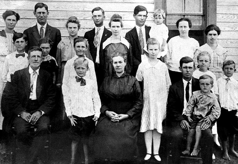 The Hooten family was a large rural Texas family. All we have is the name of the family and the fact that they lived near Lockney, Texas. Lockney is a small town town in Floyd County, in west Texas near the base of the panhandle. It was a town where farmers and ranchers would buy supplies. It was the subject of a PBS POV program, 'Larry v. Lockney' about a school district's mandatory drug testing program (2002). (Typically for POV and PBS the program is a criticism of the local community and America. That is fair enough in a free society, but why does the POV serices in particular and PBS in general never have programs about the strengths of America?) The Hootens almost certainly were a farm/ranch family if they lived near Lockney. The family consisted of 19 people in three generations. We see the grandparents, adult children, and thge grandchildren. Grandfather looks to be about 60 years old. That would mean that he was born about 1850. We do not know just when he or his parents cane to Texas. The boys wear a variety of blouses, knee pants and knickers. The younger boys are all bareffoot which was common in Texas at the time. The girls wear plain dresses. The portrait is undated, but looks like the eaerly 1910s to us because we still see some of the younger boys wearing knee pants. The older boys are no longer wearing blouses with Fauntleroy collars, but the younger boy on dad's lap is wearing one. An older boy at the left wears white shirt and bowtie with knickers and black long stockings. One boy has a small floppy bow. The girls wear plain dresses with long white stockings.