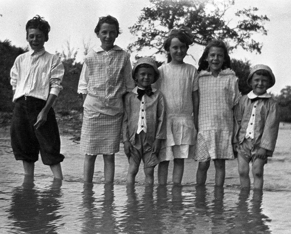 Here we have a photograph of all the children, three boys and three gurls. The two oldes girls could be relatives or family friends, but they are probablyt all one family. The age progressuin looks about right. The snapshot looks to gave been taken on the same day as the photograph of the boys in their cut-away jacket suits. They are wearing their caps a little differently. I'm not sure wjhose idea this was. The younger boys despite the temperature are still wearing their suits. Their brother wears a blouse or shirt and has his collar buttoned. The girls wear a variety of dresses and pinafores. To cool off, they have taken off their shoes and stockings and are wadeing in a stream. In the days before air conditioning, keeping cool during the summer could be a real problem.