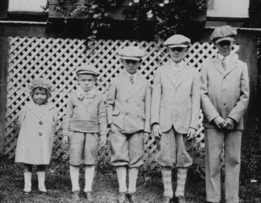 Here we have a photograph of the children of Glenn Jacob Roy Thornton Toothman, Sr. and Elsie Huffman (Rees) Toothman. They are lined up in friont of the family home by height. The children are[left-right]: Bettie Jane (Toothman) Halvorsen, Melvin Lee Toothman, Glenn Jacob Roy Thornton Toothman, Jr., Frederick Rees Toothman, James Sterling Toothman. The children look to be about 4-12 years of age. The shnapshot is undated, but looks like the late 1920s. Notice the variation in the boys' clothing, except that they all wear flat caps.