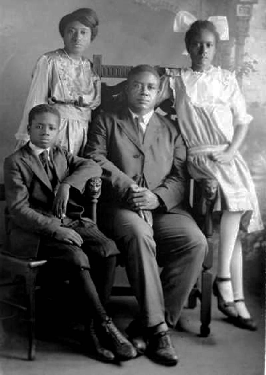 This is a portrait of a middle-class black family. The family is not identified and the portrait is not dated. We would guess it was taken during the 1920s, probably the mid-20s. The boy is about 12 years old and wears a knicker suit with long black stockings, standard boy's wear at the time. His older sister is elegantly done up in white with a large hair bow and white long stockings. This was also standard for girls at the time, especially when dressing up. We have no information about the family. We think it is clear that they were an urban family, middle-class family. This is suggested both by the way they are dressed as well as the size of the family. At the time there were limited opportunities for blacks, so we might guess father was a preacher or a teacher in a segregated school. There is no suggestion, however, as to where they lived. The 1920s was a time of great transition for black Americans. Before World War I, blacks were largely a rural Southern population. Because of the general poverty of rural blacks, they are under represented in the photograophic record. The Great Migragtion began during the 1910s and the War was a factor. Blacks were streaming north, fleeing the repression, sharecropping, and lack of jobs in the South and seeking jobs in the large industrial cities of the Norrtheast and Midwest. In this case, we suspect that this family was part of the small middle-class in a Southern city.