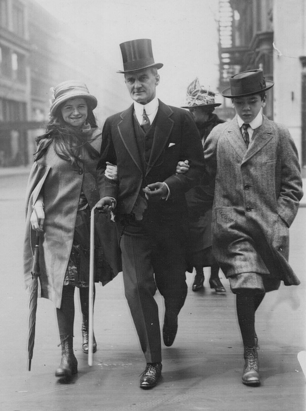 Here we have a view of Finley J Shepard (1867-1942) strolling down New York City's fashionanable Fifth Avenue with two of his adopted childrenin her best Easter togs. Fifth Ave was famous for the Easter Prade here society strutted to display their fashionble finery. We do not know much about Mr. Shedpard, other than he was an executive at the the Missouri Pacific Railroad. Rather unusually for the time, we know a great deal about his wife Helen Miller Gould (1868-1938), principally because she was the daughter of the notorious Jay Gould who finally began investing in railways. Shepard presumably becuse Gould gained contol of several railroads. Helen could not have been more different. She was determibed to create a very differnt for the family. She not not only began gining away her ineritance to charitavler groups, but also adopting New York City orphan waifs. They adopted three children and had one foster child. We are not sure how her husband viewed this, but she gave away much of her inheritance. She was not only a philantropist, but a staunch critic of Soviet Communism, primarily on religious grounds.