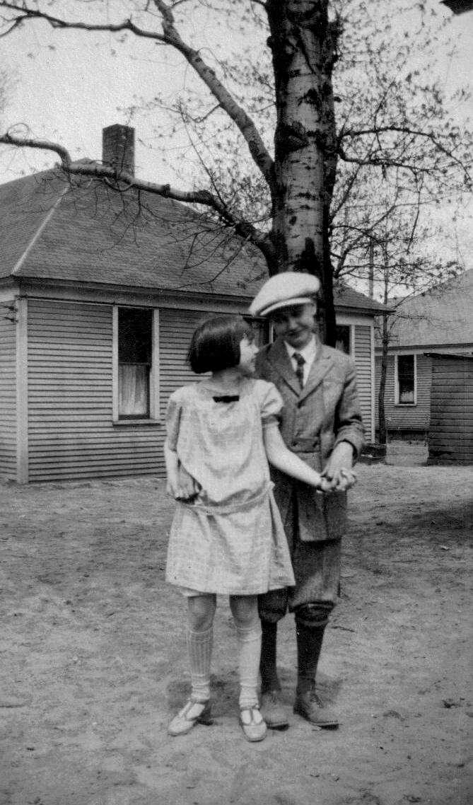 Here we see an unidentified brother and sister in 1924. The children look to be about 8-12 years old. We are not sure where tey lib=ved, perhaps the Mid-West. They seem very close, looking caringly at each other, obviously enjoying having their picture taken. I rather thought of Scout and Jem from To Kill a Mockigbird, but tghey were not that clinging with each other and of course Scout hated dresses. The girl has bobbed hair doine in bangs, a popular hair style for girls at the time. She wears a plain dress with a waistband, knee socks, and "T"-strap shoes. Notice the long bloomer underwear showing at her dress hem. Her big brother wears a flat cap, a Norfolk knickers suit, and dark long stockings. The snapshot was dated 1924.