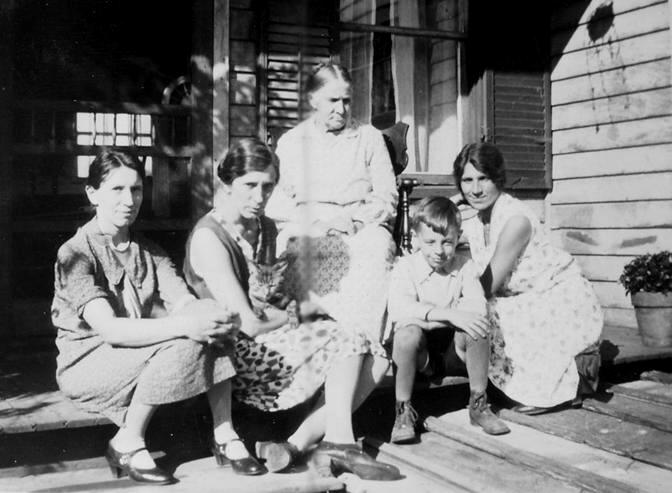 Here is a family photo taken in the vicinity of Utica, New York (upper New York State) during the summer of 1930. We dont' know the family name for certain but the ladies in the photo are "Grandma", "Mom", "Aunt Udle", and "Puss" according to notes on the back. The boy's name is Bob and he is 8 years old in the photo. The photo comes from an album with the name of Elma Jones on the cover, so perhaps the boy's name is Bob Jones. One interesting feature of the photo is that Bob is wearing tan long stockings with supporters even though it is summer time (notice the detail of the boy enlarged). Notice also the long-sleeved white shirt and the hightop shoes. Such summer clothes were not unusual, apparently, in middle-class families in the early 1930s. This would change during the 1930s as long stockings declined in popularity, especially for summer wear. The photo looks as though it were taken in front of the family home on something like a porch.