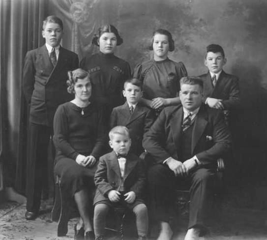 The seller dates this unidentified family portrait to 1932. There is nothing on the picture itself to confirm that date, butit was presumablyn other material associated with the portrait. We think it'is a reasonable date. The boy's hightop shoes make us think that it is probably early 1930s rather than later when boys often wore low-cut Oxfords. Does the size of the suit lapels give any clue to the date? They are bit wider than I would have expected for the early 1930s, but lapel width is not a topic we have considered in detail yet. We obviously have a family photo here with quite a number of children, four boys and two girls. Since this photo probably dates from the Great Depression, I suspect that such a large family might have been Catholic. The origin of the photo seems to be Connecticut or at least New England, but we can't be certain of that. The children are all very formally dressed for the photo, the boys in white shirts with ties and dark suits. The youngest boy, about six, I would guess, is wearing a short trousers suit with a bow tie. He wears tan long stockings clearly held in place by supporters and hightop shoes. The photo could have been taken in a studio. The drapery in the rear looks a little artificial to me. The older boys wear double-breasted suits. The oldest boy, about 18, is wearing long trousers. The two other boys who are standing seem to be about 14 and 11 or 12. We can't see their legs, but they might well be wearing