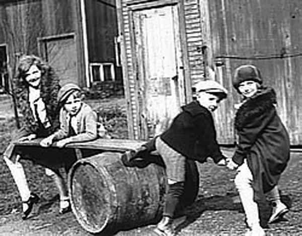 We also see the Weber children playing in their yard with a hand-made seesaw, fashioned from a barrel and wooden plank. The photograph is a little strange because the children do not seem dressed in play clothes. Apparently mom wasn't strict about that. Notice that the children wear long stockings for play as well as