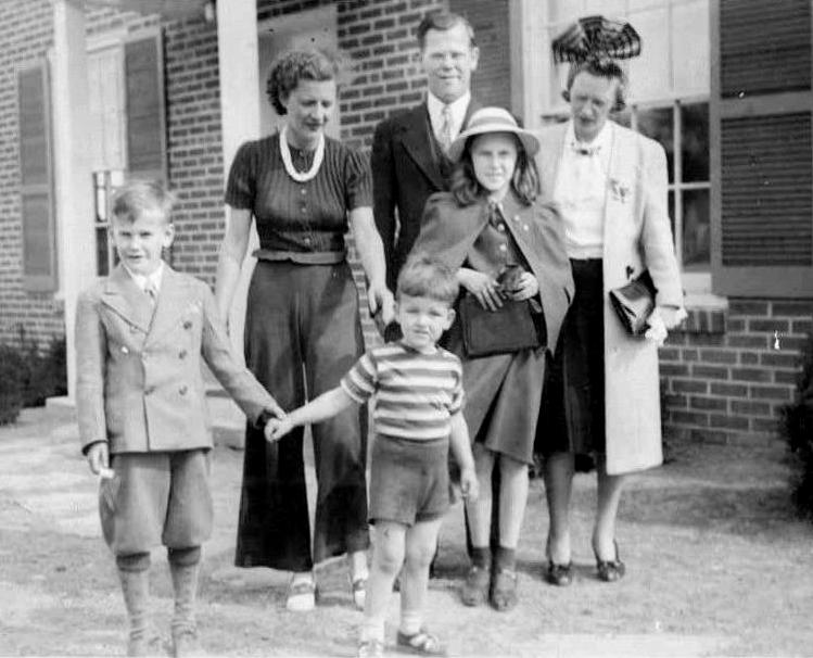 This is tough one to tie down to a decade. We know it was taken in the late-30s or early-40s. They look like a family in comfortable circumstances. You can see their house in the background. We see a well dressed father and informally dressed mother--notice the fashionable pants. The woman with the fancy hat is probably grandmother. The children look to be about 3-12 years old. The yonger boy wears a striped T-shirt, shorts, and sandals. The older boy weas a double-breasted knickers suit. The girl wears a wide-brimmed hat, cape, and matching dress. We womder if it might be a school uniform. The little boy's outfit looks rather like the 40s. The older boy's knicker suit looks more like the 30s. We would guess the photograph was taken in the late-30s, but the very early-40s is definitely possible.