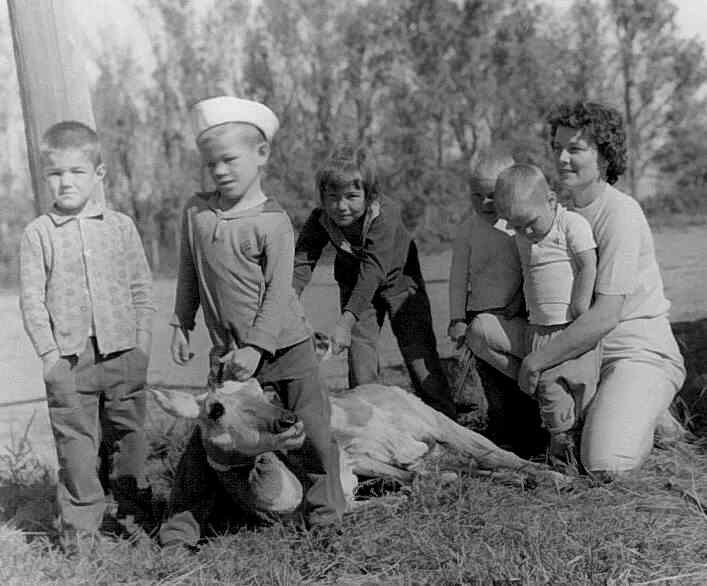 Here we see a North Dakota farm family (figure 1). They seem to be wrestling with a goat. The photograph is undated, but looks to have been taken in the late 1940s. Notice mom is wearing pants. That is something we see in rural areas and later in suburbia after the War. We suspect that war service and factory workk were factors here. Also note the little girl wearing pants.