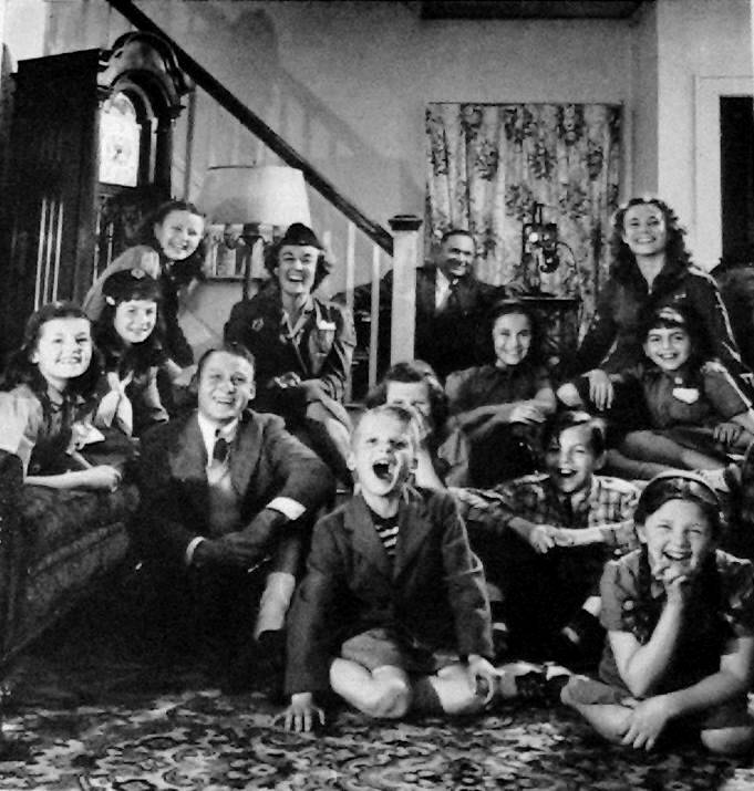 Here we see a family scene in a middle class home. The familky is unidentified, but the picture seems to be a Girl Scout or Brownie meeting. The Girl Scouts and Boy Scouts despite the similr nme were two entirely seprate organizations. While separate, they were both youth organizations in which the family played a key role. This was especially true at the Brownie and Cub level. And here we see a Brownie meeting in a family home. They seem to be showing home movies. The parents and two boys are included in the photograoh, presumably the brothers of one of the girls. One boy wears a suit jacket with a striped-T shirt and short pants. Presumablky he was told to dress up for the photograph. . His older brother looks to be wearing a sports jacket, although it is difficult to tell. The photograph provides a good look at a prosperous middle-class family during the post-War period.